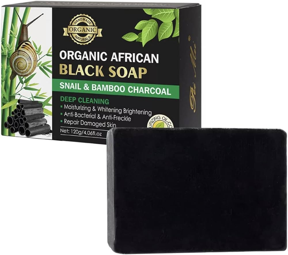 - Snail Bamboo Charcoal African Black Soap 120g Handmade Gentle Body Cleansing Soap Product Selling Points : Natural & Organic Plants: Our natural soap contains bamboo charcoal, organic tea tree oil, peppermint, eucalyptus and others essential oils, which gently cleanse all skin types. Our charcoal soap helps fight athlete's foot, acne, blackheads, eczema, and psoriasis. Our pure natural soap can naturally deodorize, soothe dry and itchy skin, and provide you with clean and fresh skin . GENTLE ENOUGH FOR ALL SKIN TYPES - It's free from sulfates, parabens, preservatives, suitable for all skin types, and gentle enough for daily use. Our soaps for hands, feet, face or body are very suitable for men, women and teenagers. With no synthetic ingredients, our black soap naturally has scents of tea tree and mint, with no synthetic fragrances, petroleum, or detergents that can cause discomfort. Everyone can enjoy cruelty-free, vegan, and gluten-free skin care and cleansing.